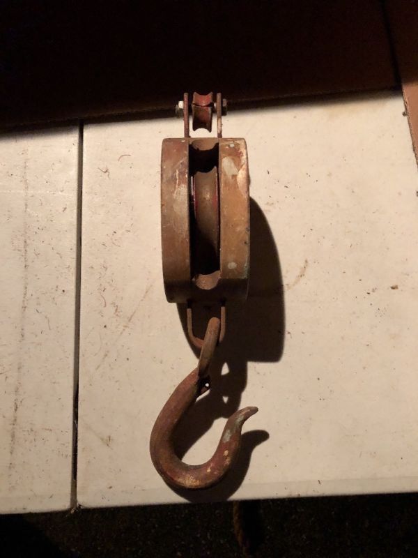 Title (ebay affiliate link): Wood Cast Iron Wheel Pully Block Tackle Tractor Barn Rope Cabin Antique Farm Cow