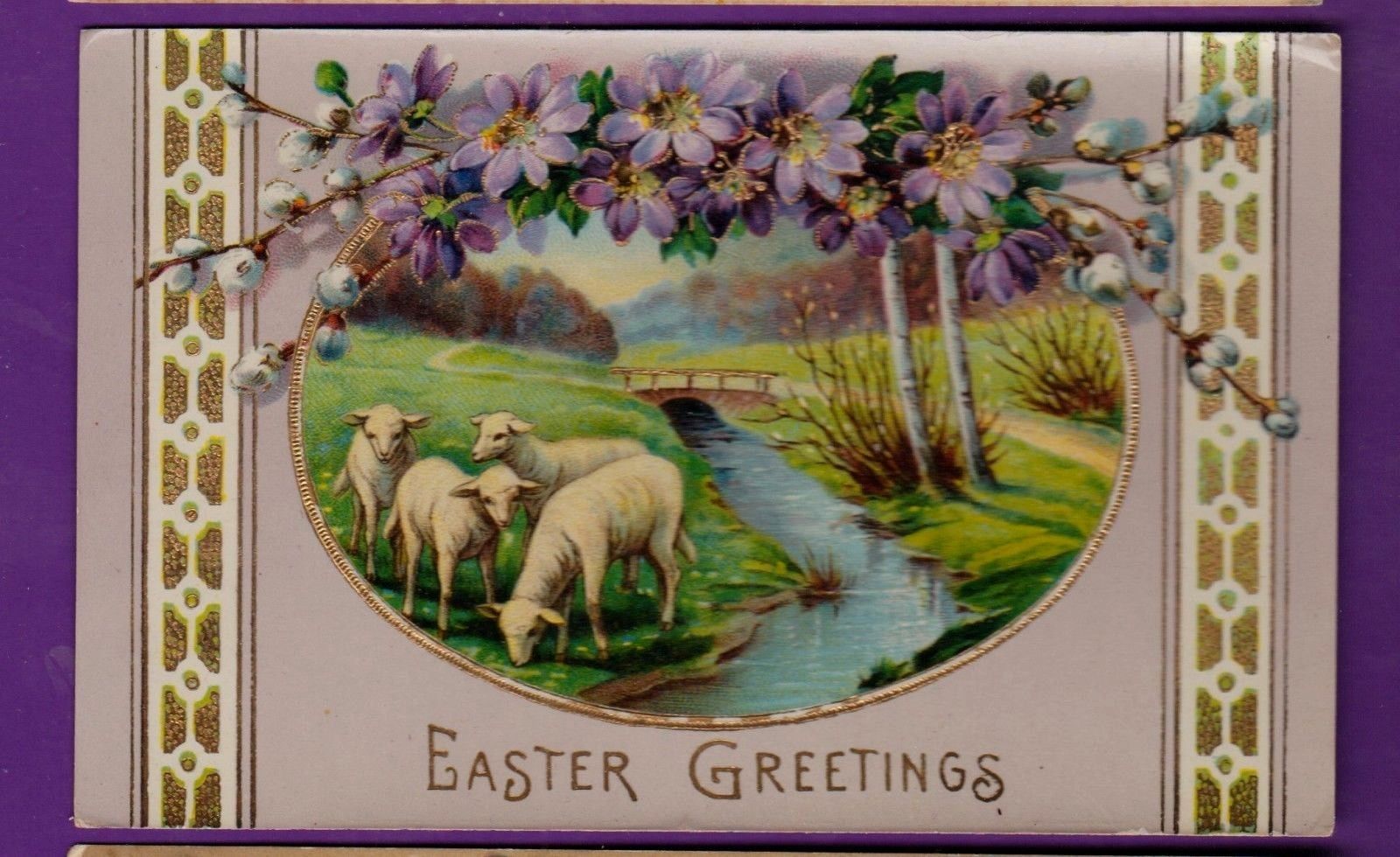 Easter embossed glossy postcard/ sheep in field/ purple flowers/ gilded