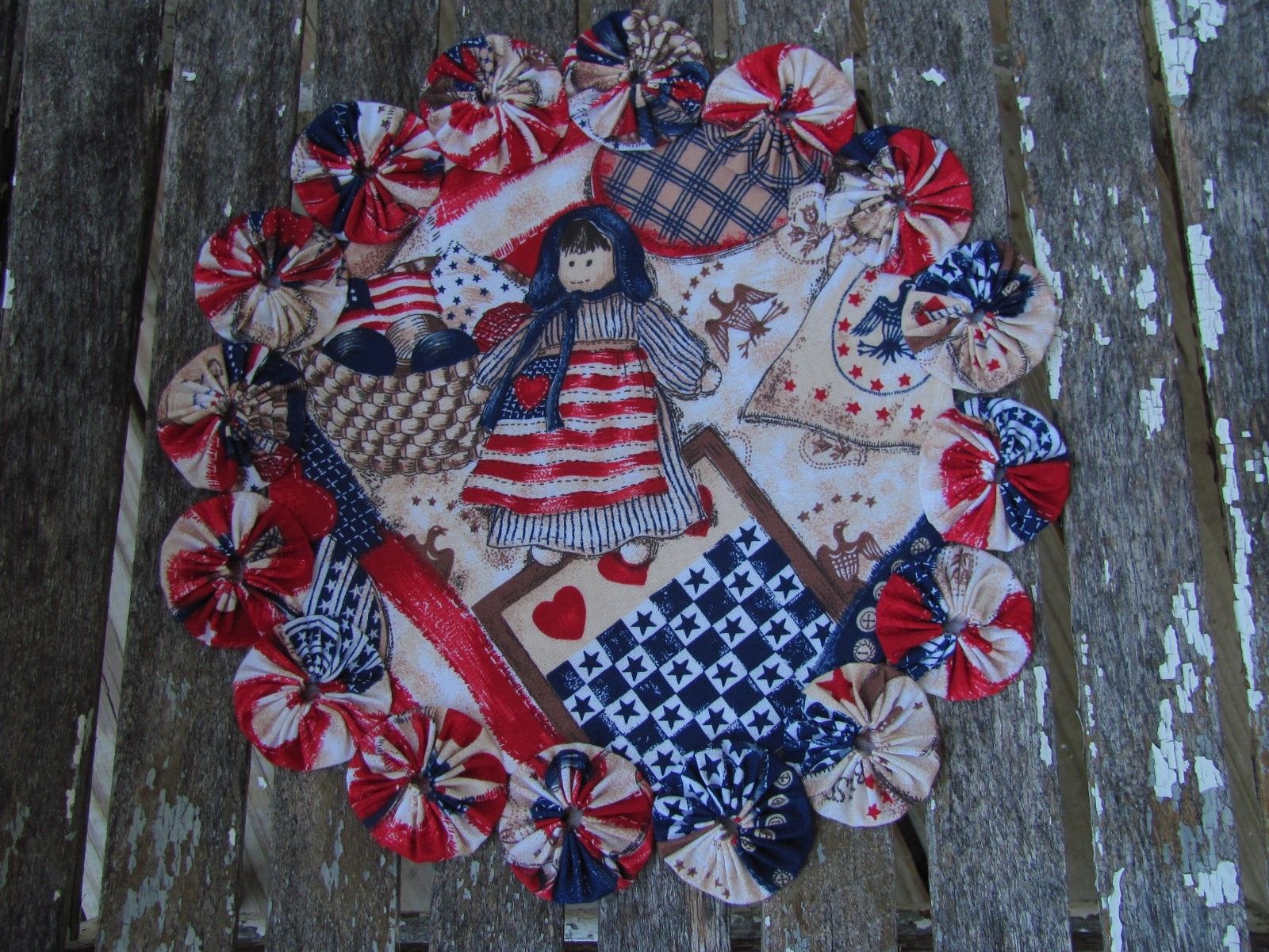 Primitive Rag Doll Patriotic USA Flag Fabric Yo Yo Candle Mat Penny Rug Style