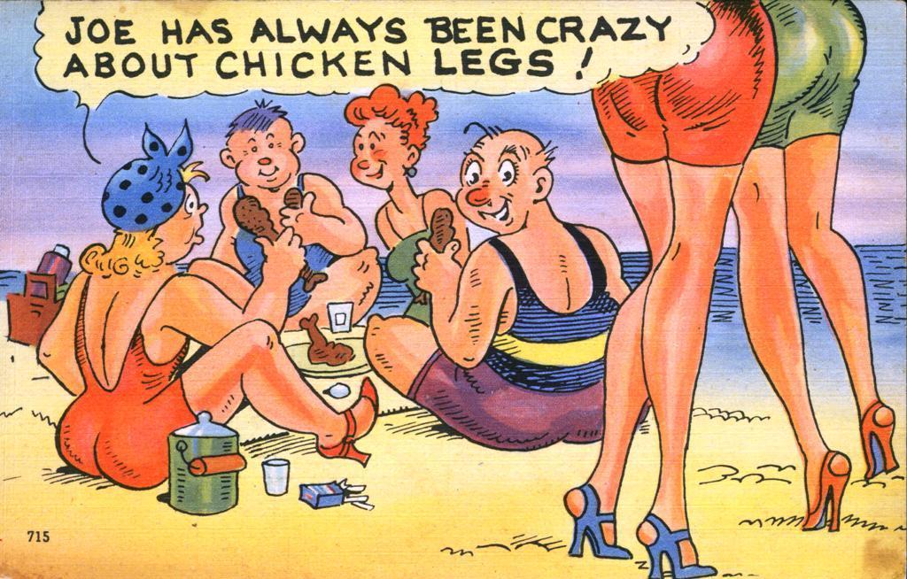 Title (ebay affiliate link): COMIC, Joe is Crazy About Chicken Legs! Sexist Linen Vintage Postcard Z1738