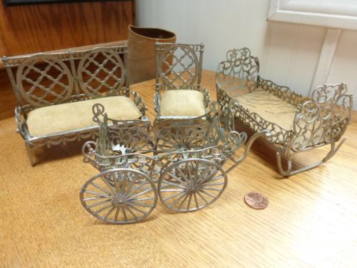 Title (ebay affiliate link): 4 Antique lead pat''d 1893 dollhouse furniture baby carriage couch chair cradle
