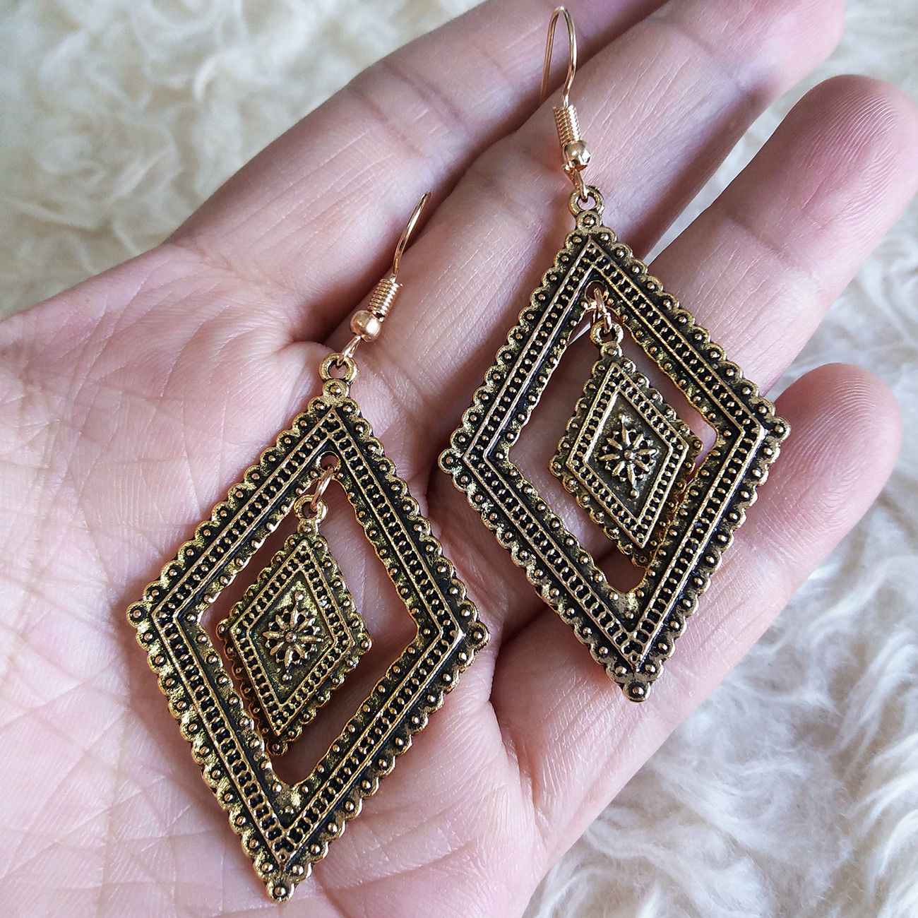 Title (ebay affiliate link): NEW Vintage Womens Antique-Gold-Tone Patterned Rhombus Dangle Drop Hook Earrings