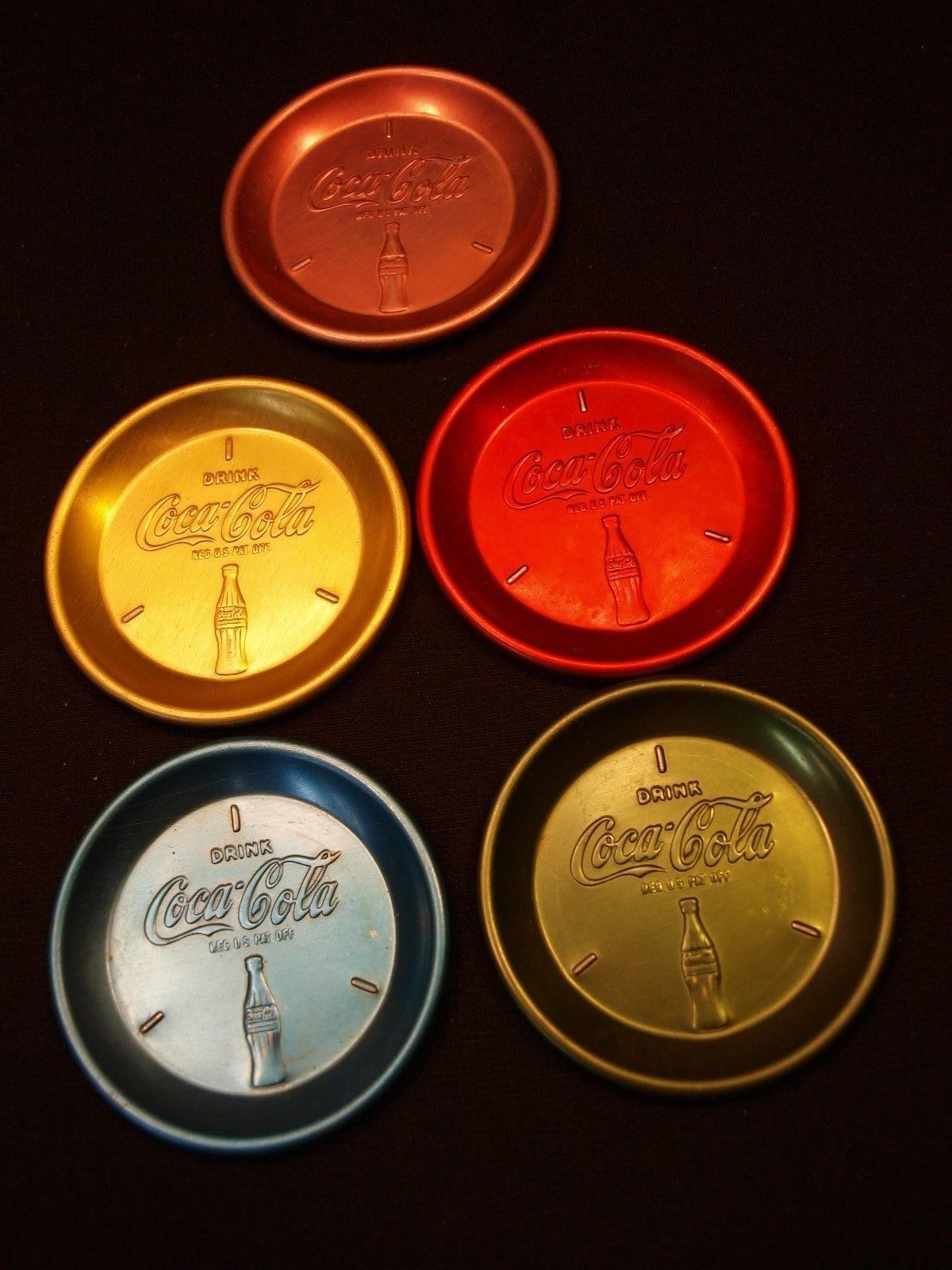 Title (ebay affiliate link): Lot 5 Vintage Multi-Color Aluminum Drink Coca Cola Advertising Barware Coasters