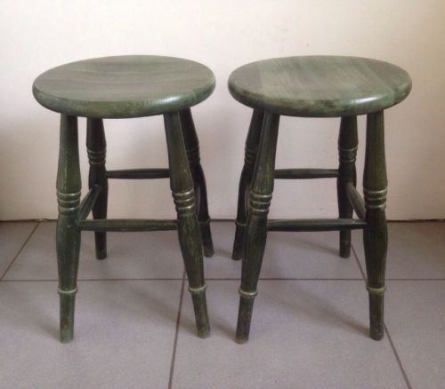 Pair Of Vintage Pine Stools / Green - 52cm Tall