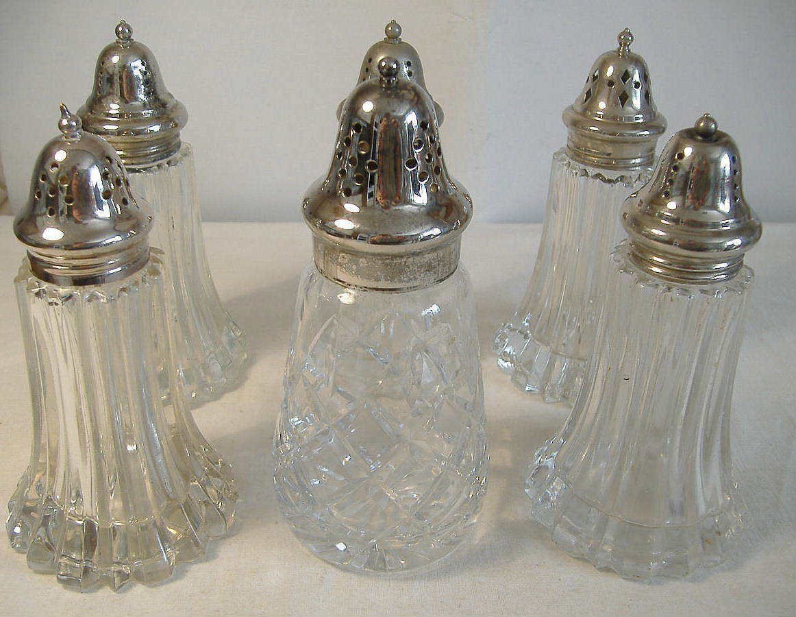 Title (ebay affiliate link): 6 ASSORTED GLASS & SILVER PLATE SUGAR SHAKERS - JOB LOT 1