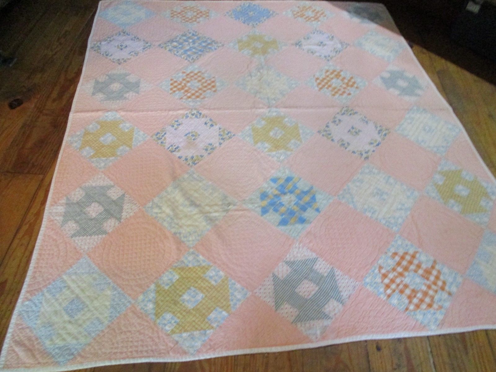 Title (ebay affiliate link): ANTIQUE HAND STICHED QUILT--"CHURN DASH" PEACH BLOCKS