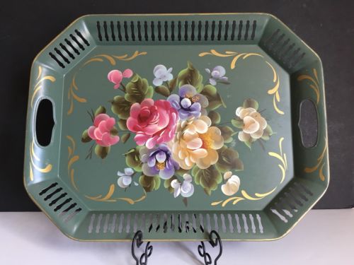 Vintage Toleware Tole Hand Painted Metal Tray FLORAL FLOWERS
