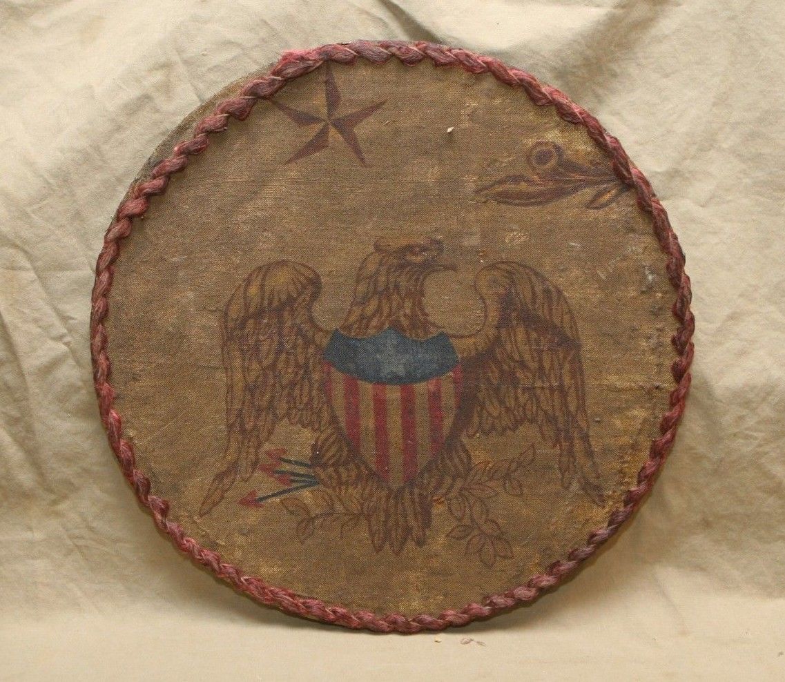 Title (ebay affiliate link): Vintage Antique Mounted American Motif Textile on Wood Round Eagle Shield Star