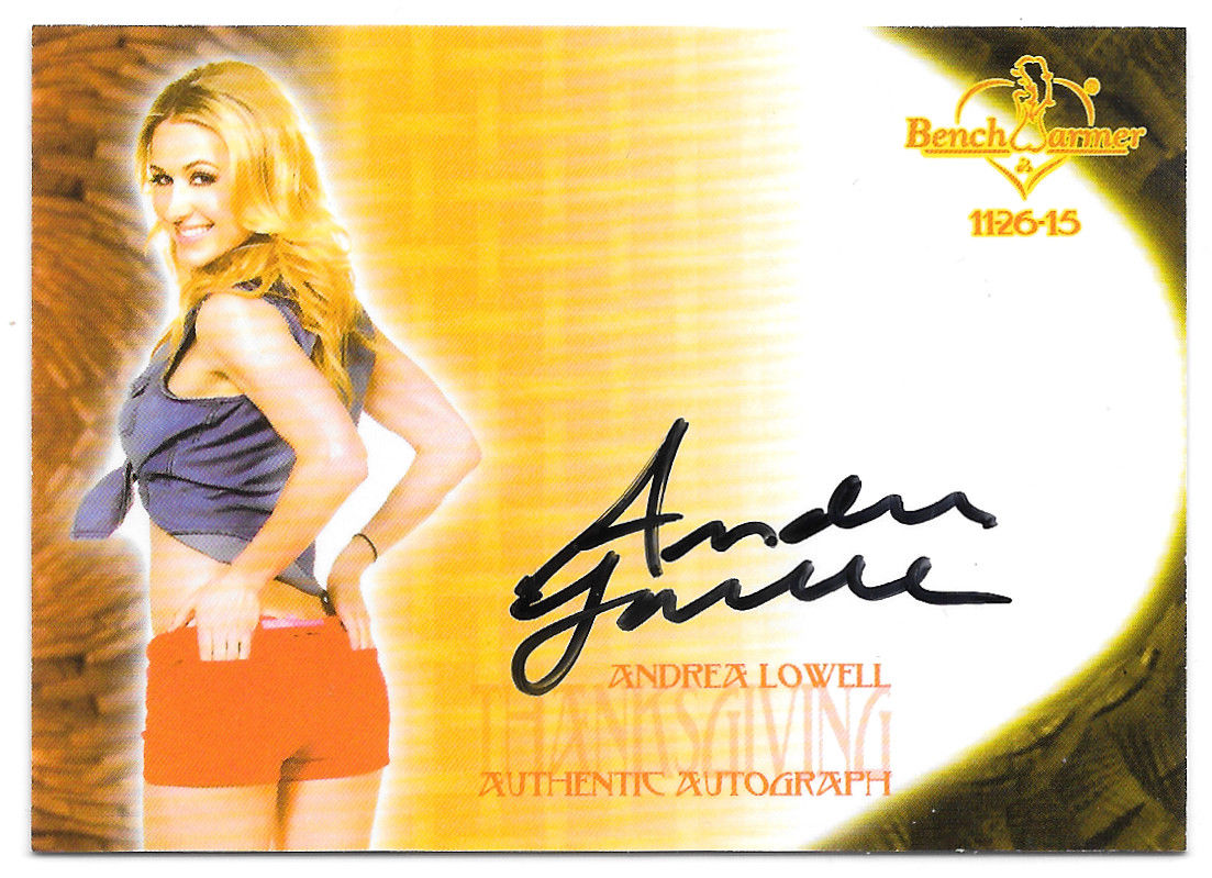 Title (ebay affiliate link): 2015 15 BENCHWARMER ANDREA LOWELL THANKSGIVING PROMO AUTO AUTOGRAPH ON CARD # 32