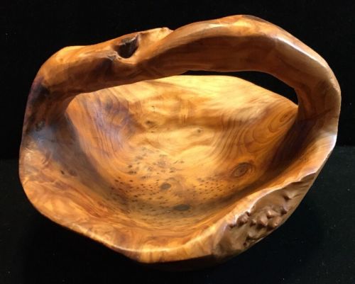 Burl Wood Carved Basket Bowl With Handle. Lots Of Character (MM)