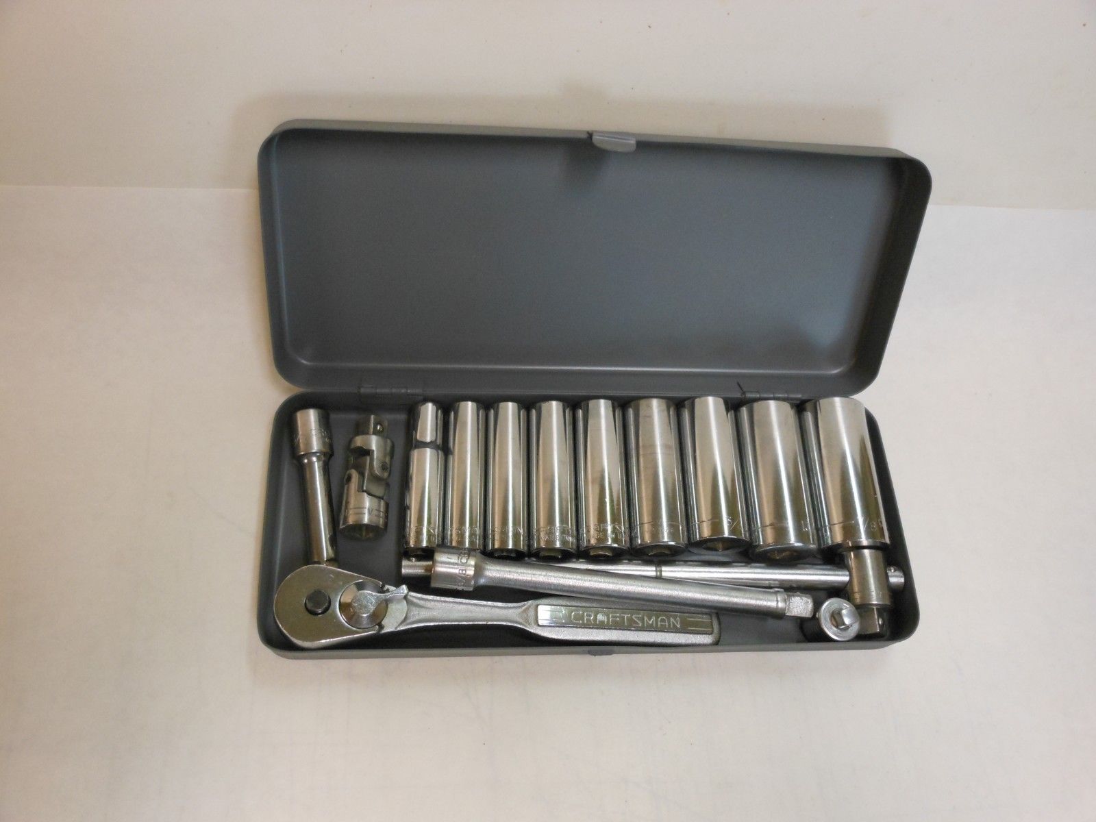 Title (ebay affiliate link): Vtg Craftsman 3/8 Drive V Series DEEP 6 pt 15 pc Socket Wrench Set Seamless Box