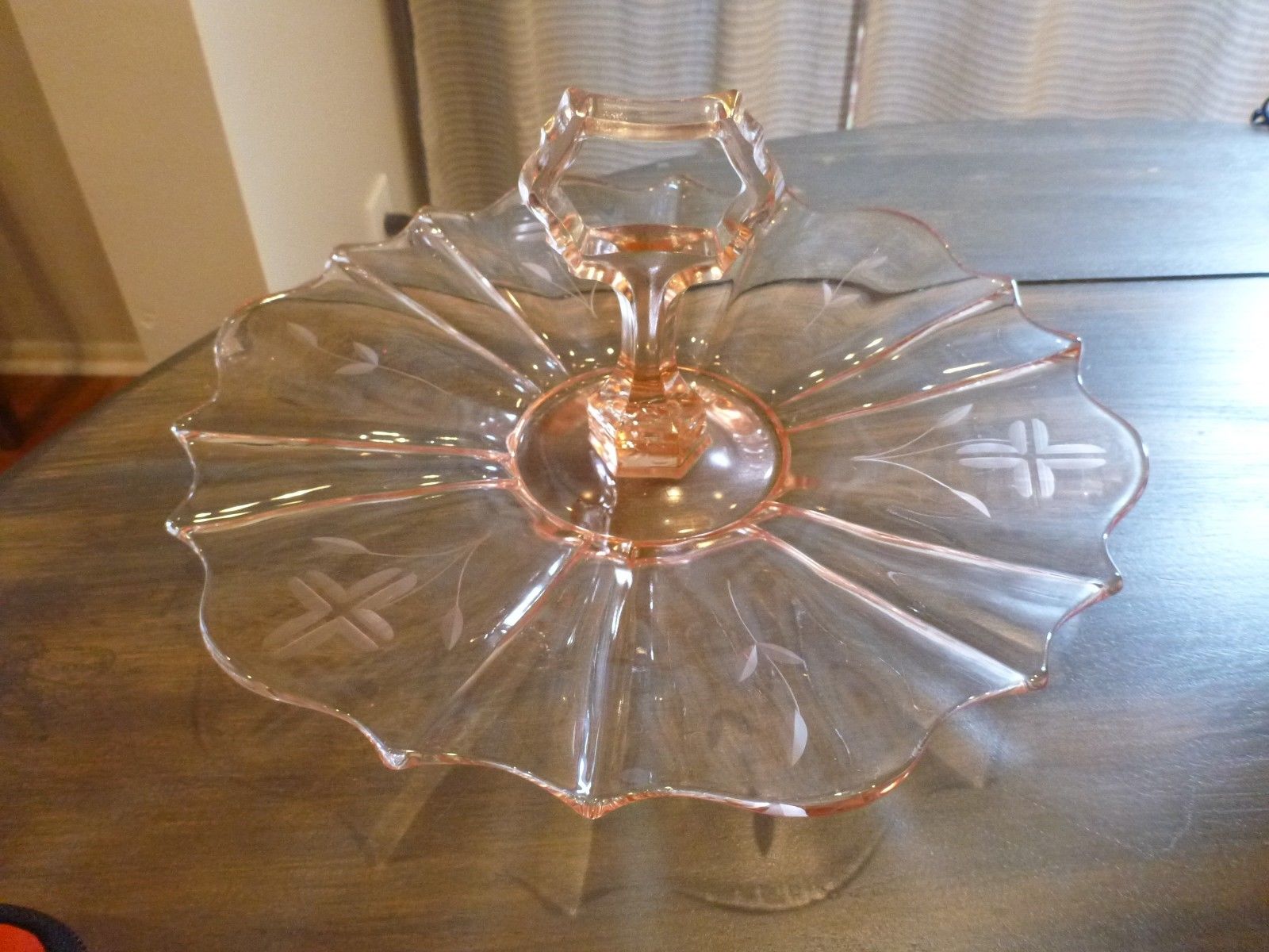 Title (ebay affiliate link): Depression glass serving tray with handle Pink tinted with flower pattern