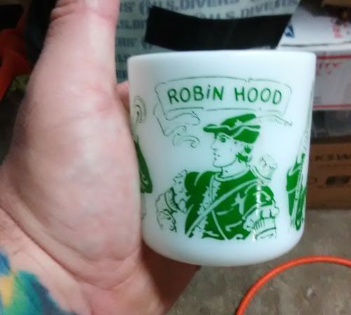 VINTAGE HAZEL ATLAS ROBIN HOOD FRIAR TUCK LITTLE JOHN CHILDS MILK GLASS MUG CUP