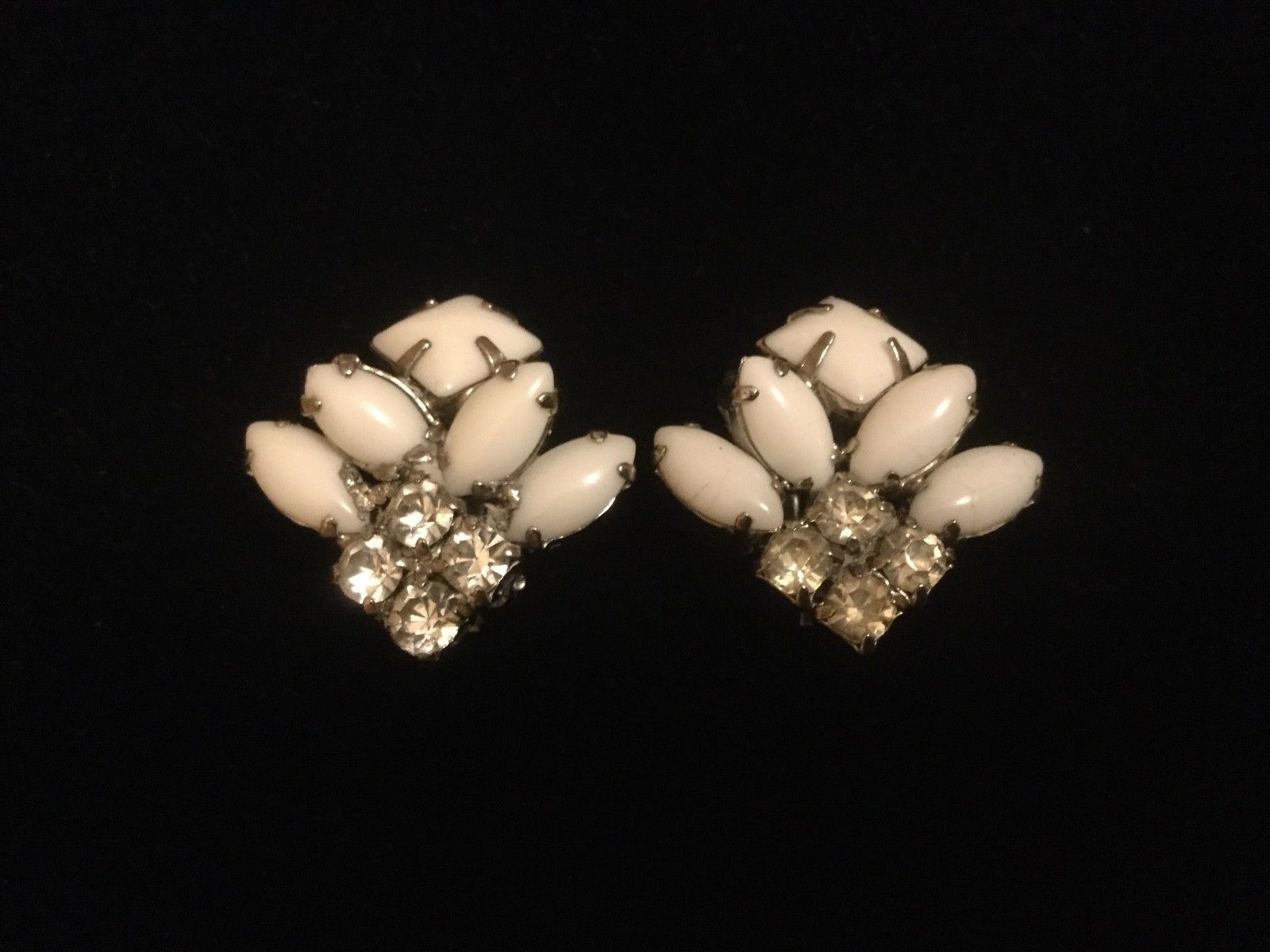 Title (ebay affiliate link): Vintage Unsigned Clip On White Milk Glass and Rhinestone Earrings estate find