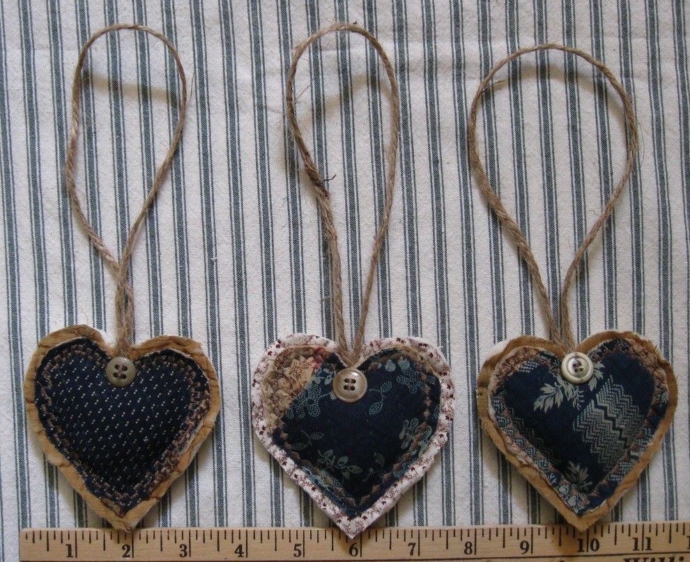 Title (ebay affiliate link): 3 Primitive quilt heart ornies 3-1/2" ea Americana NEW handmade