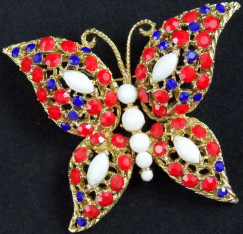 Title (ebay affiliate link): VTG WEISS 2.75" PATRIOTIC RED WHITE BLUE MILK GLASS RHINESTONE BUTTERFLY BROOCH