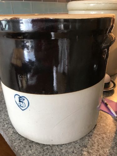 Title (ebay affiliate link): Antique 5 Gallon 2 Tone Pottery Crock Stoneware Pickle Handles USA Cobalt Blue