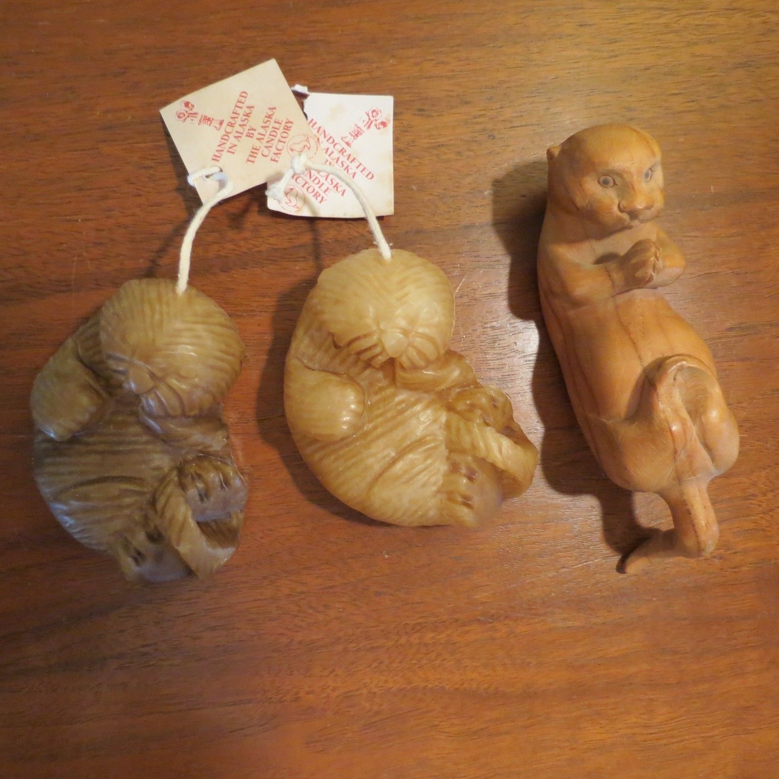 LOT of Otter Art. Artist solid wood hand carved Otter & 2 Alaska Otter Candles.