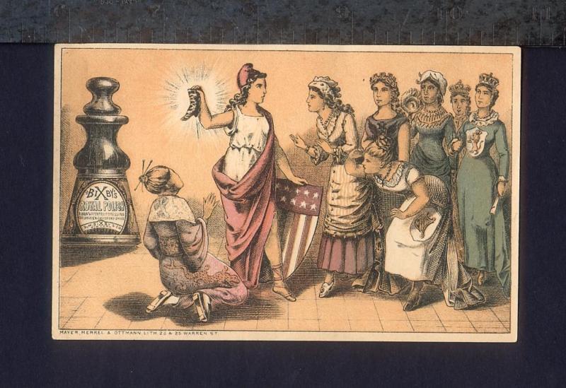 BIXBY''S ROYAL POLISH Trade Card LADY LIBERTY PRESENTS POLISH TO QUEENS