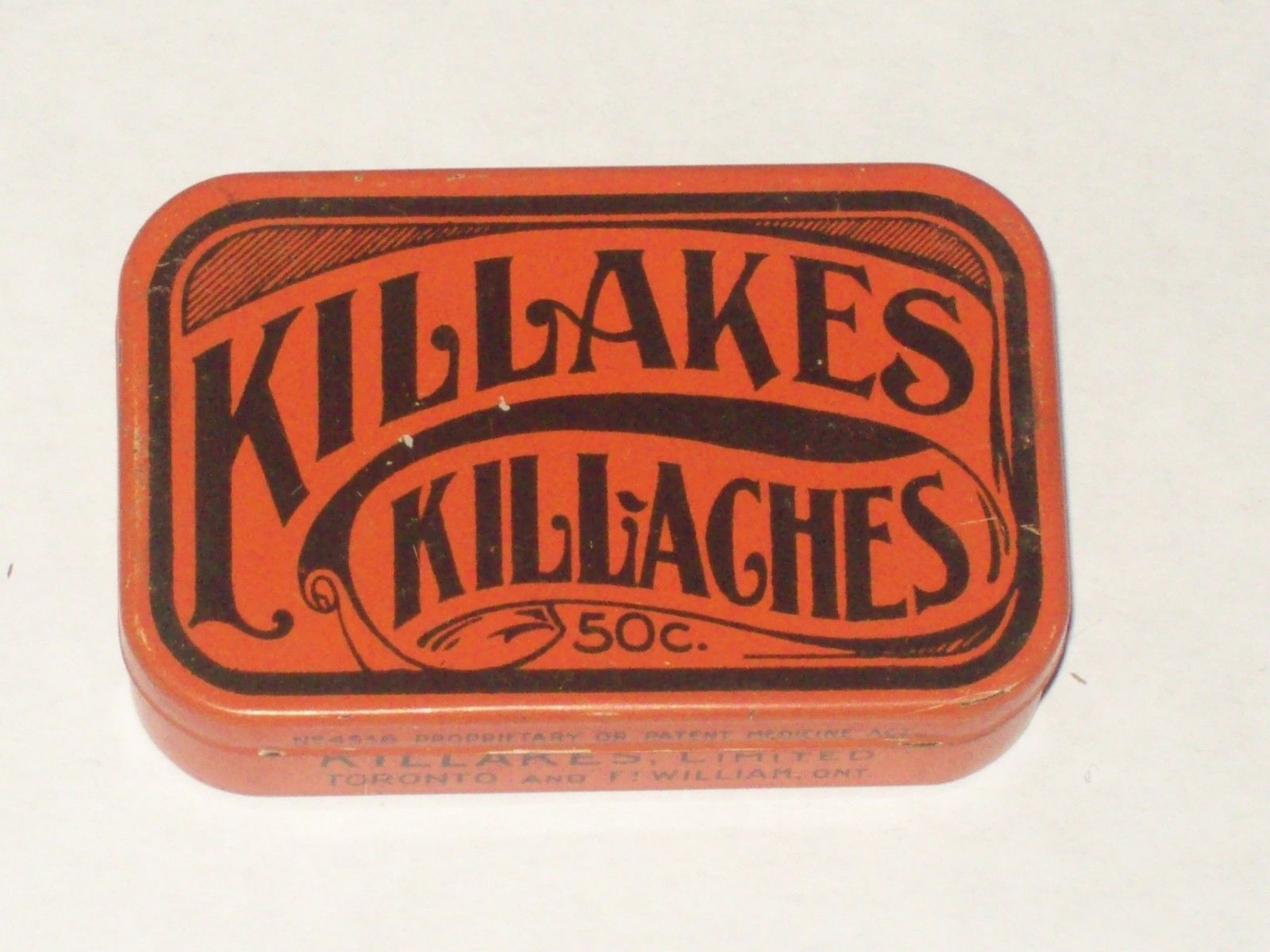 Title (ebay affiliate link): Vintage-Tin-Canada-KILLAKES-Kill-Aghes-Medicine-Empty-50 cents-1908-RARE-?-Litho