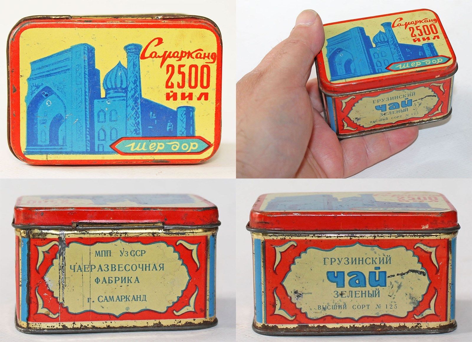 Title (ebay affiliate link): Vintage Uzbekistan, Georgian Green Tea Tin Box Factory Samarkand I960''s