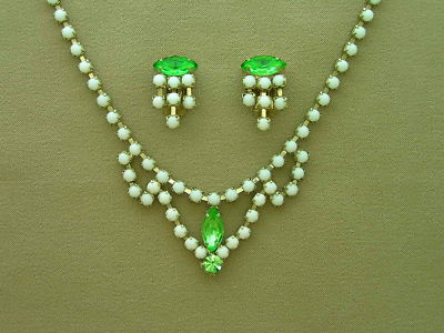 Vintage Green Rhinestone Milk Glass Necklace Earrings