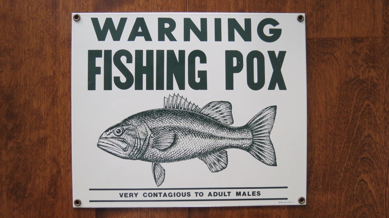 Title (ebay affiliate link): Warning Fishing Pox Contagious To Adult Males Porcelain And Steel Sign -1995