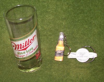 Vintage Miller High Life Beer Glass, 2 Keychains