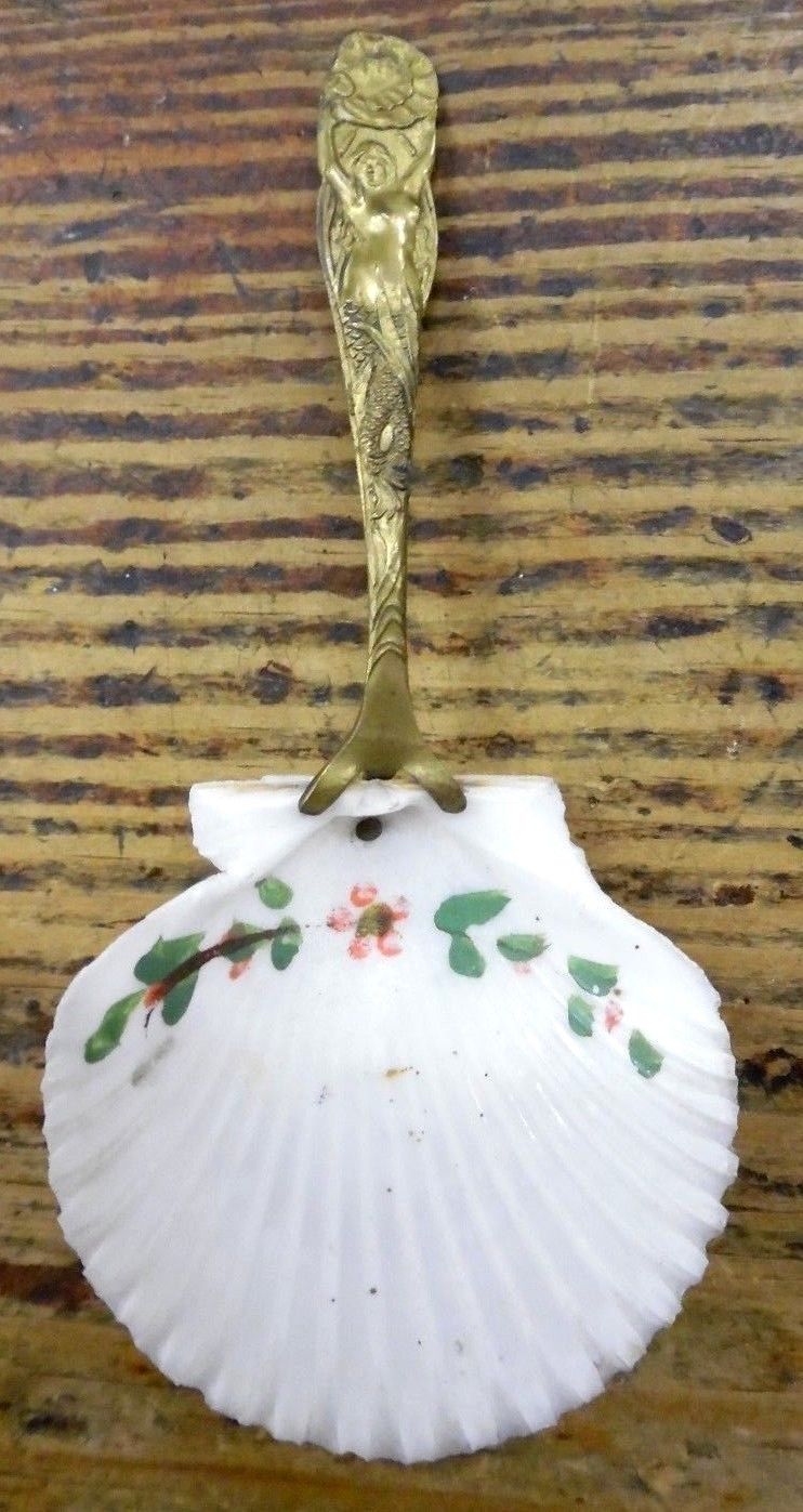 ANTQ Victorian Art Nouveau Brass Mermaid Painted Sea Shell Sugar Spoon