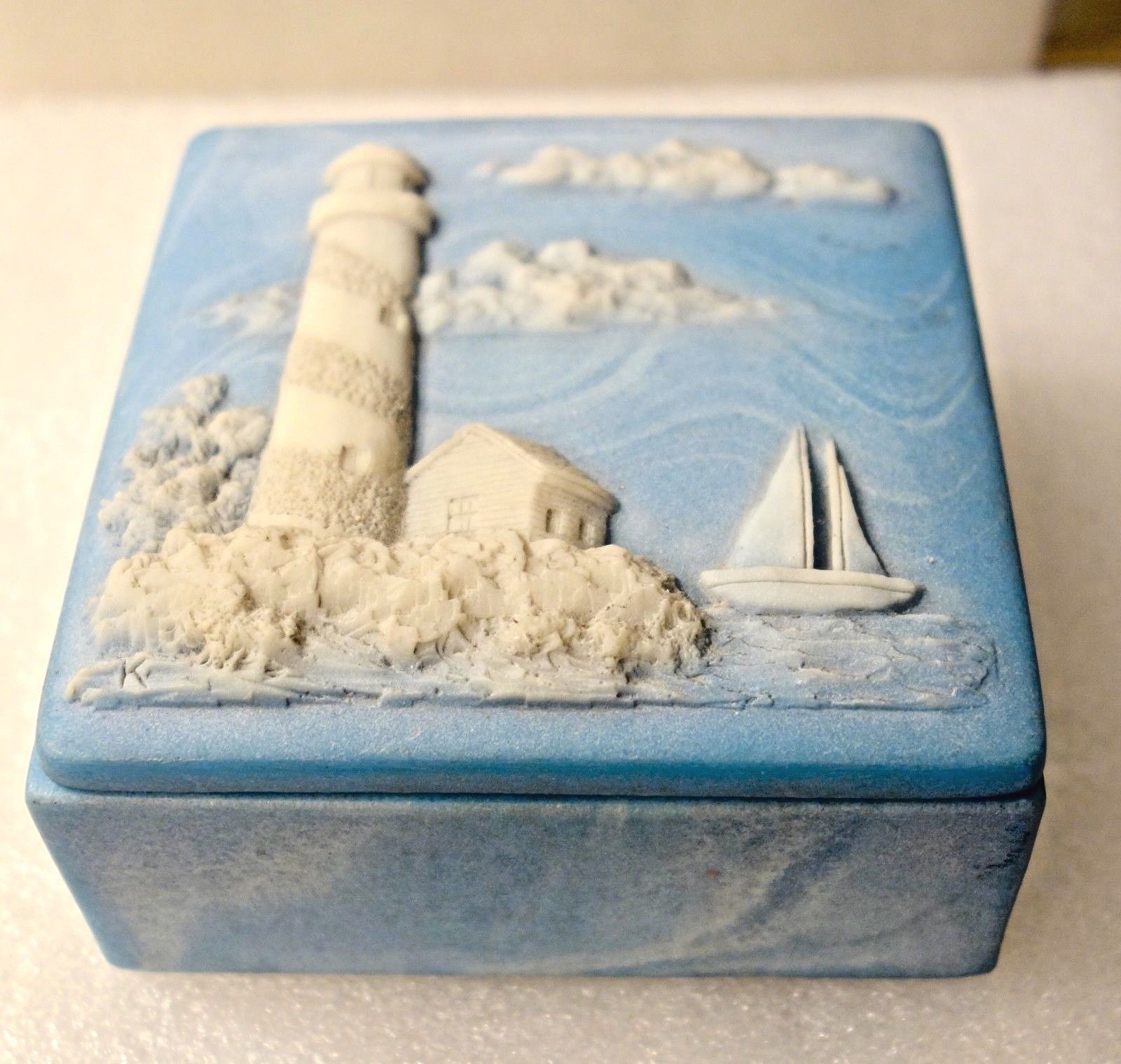 Title (ebay affiliate link): Vintage Blue & White Soapstone Trinket Box Lighthouse Sailboat Nautical Theme