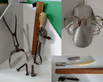 Vintage Eye Glasses w/Case, Tong, Mixer, Razors, Nails