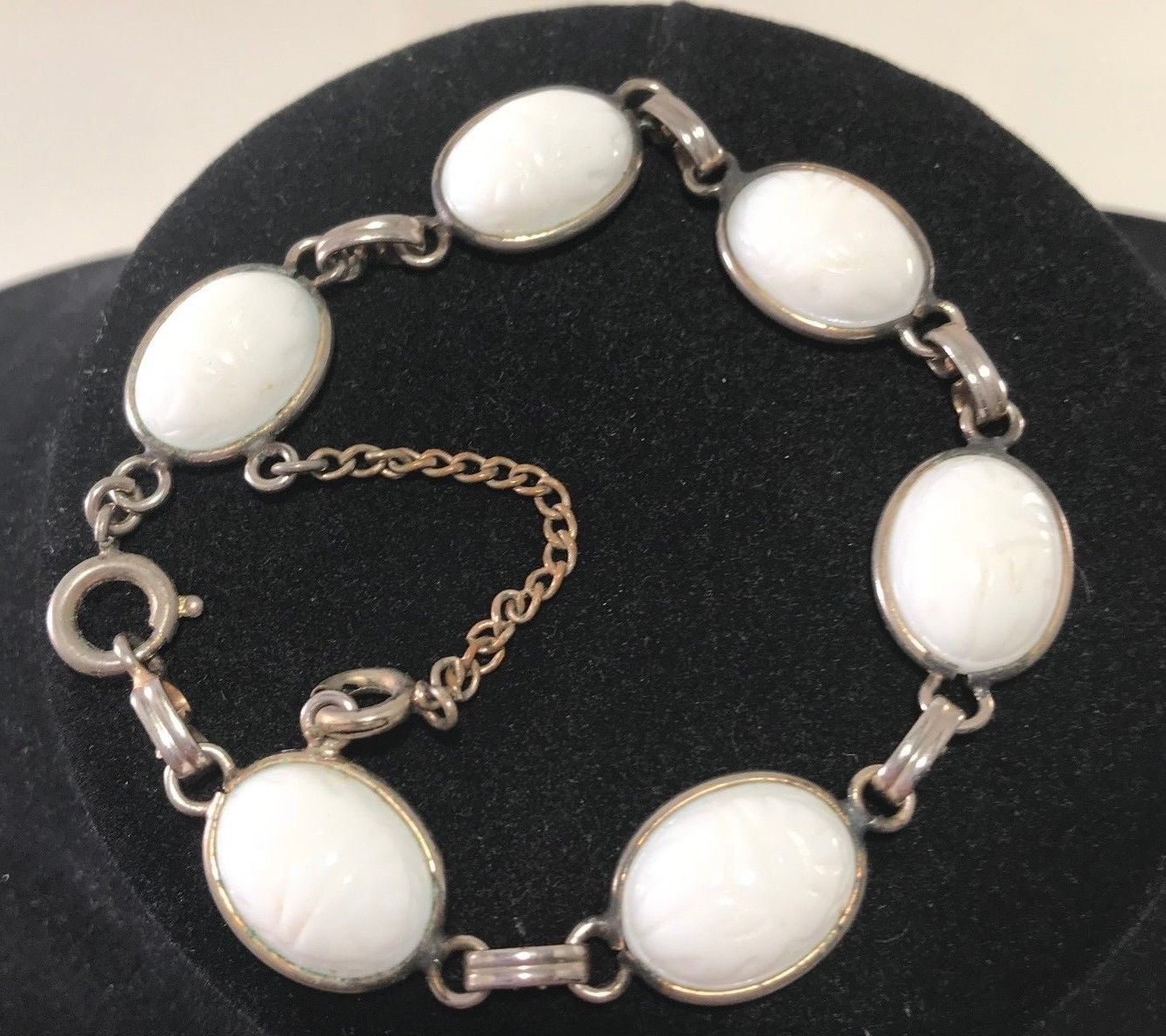 Vintage Egyptian Scarab White Milkglass Milk Glass Bead Bracelet
