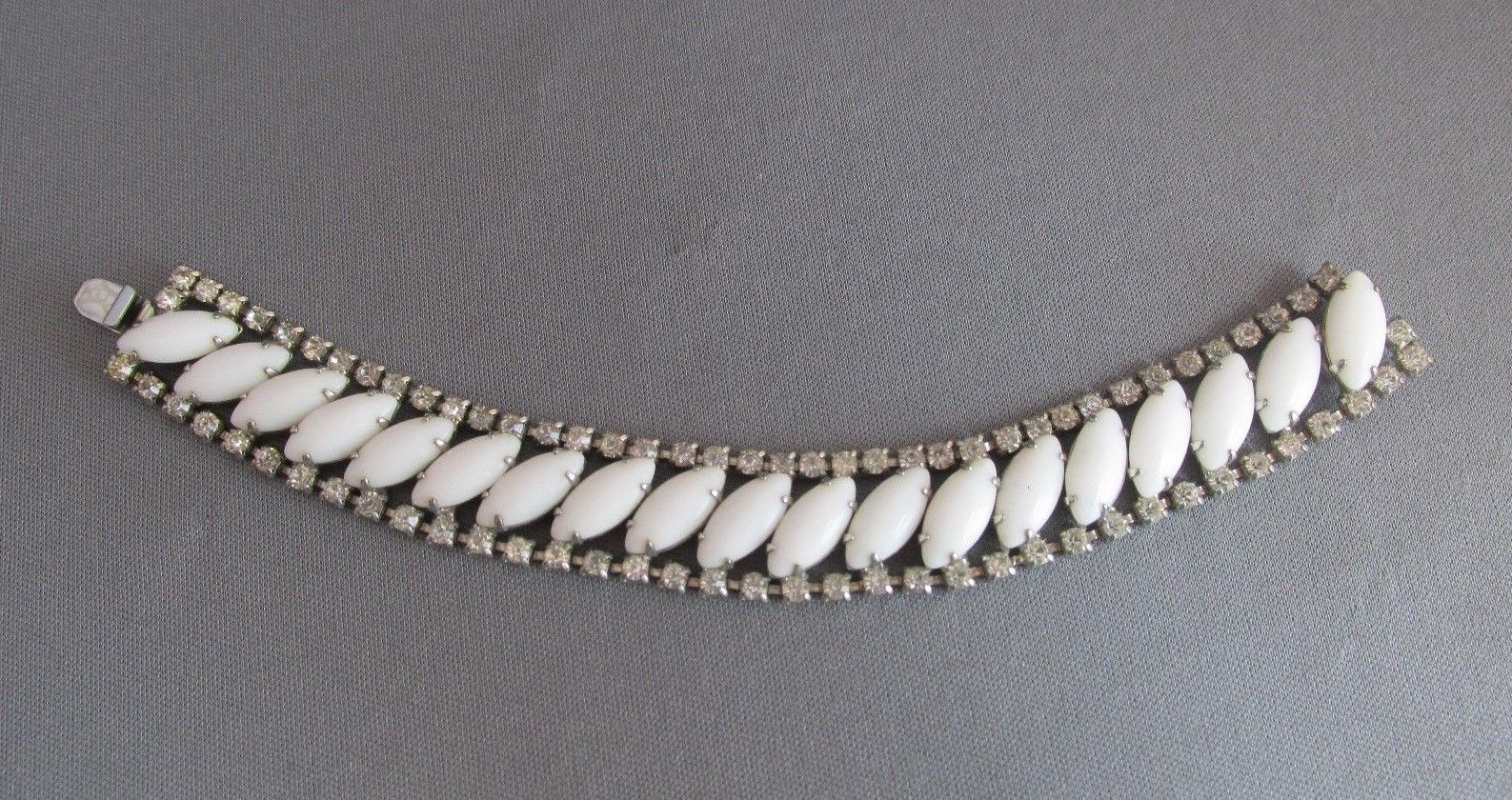 Title (ebay affiliate link): VINTAGE KRAMER WHITE MARQUISE MILK GLASS RHINESTONE TENNIS BRACELET