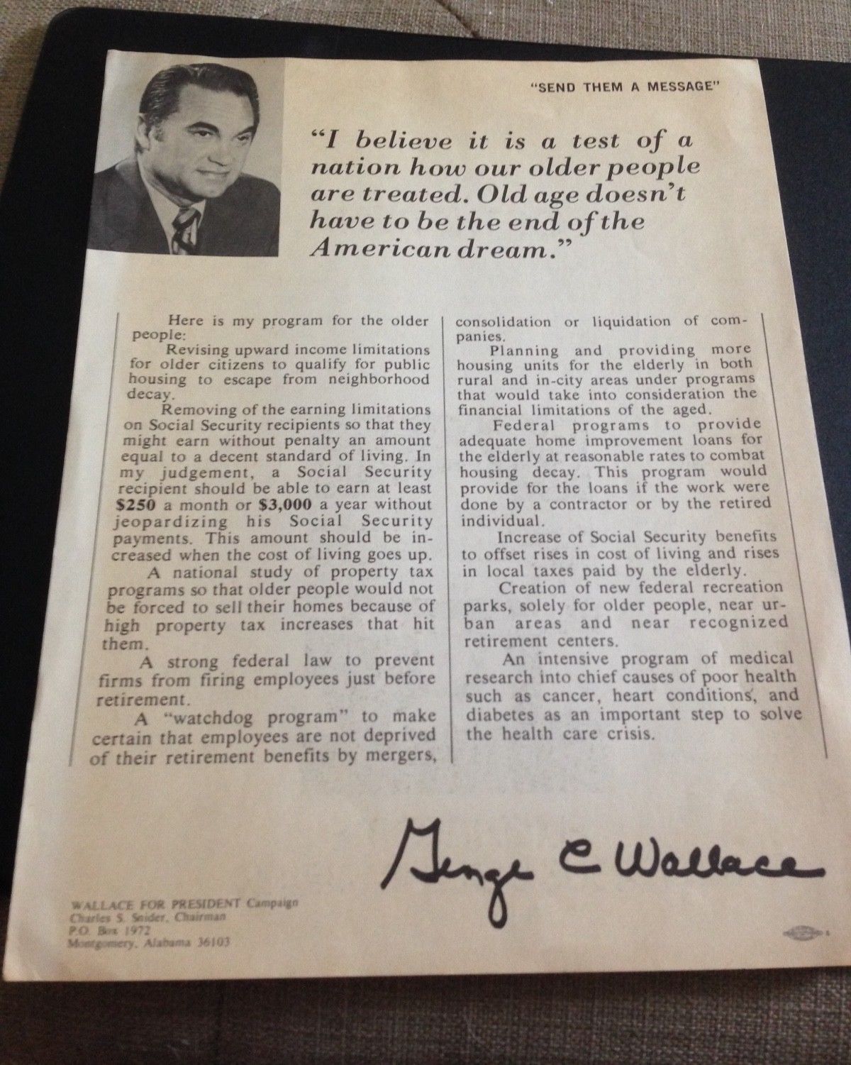 Title (ebay affiliate link): George Wallace Social Security campaign piece