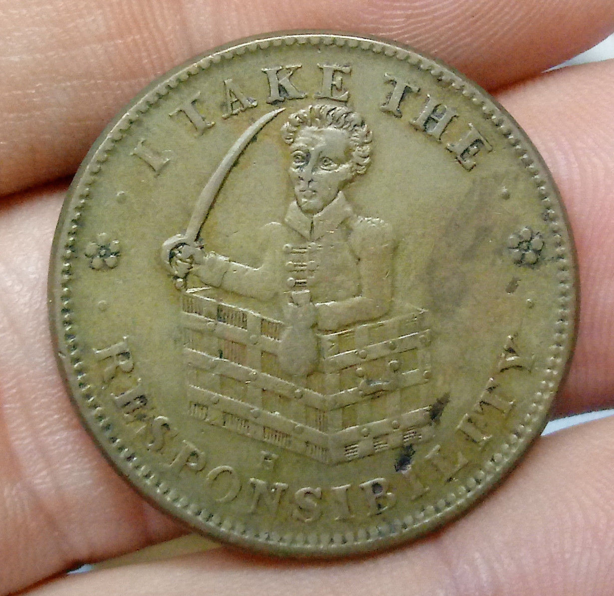 Title (ebay affiliate link): 1830s ANDREW JACKSON Hard Times Political I TAKE the RESPONSIBILITY Constitution