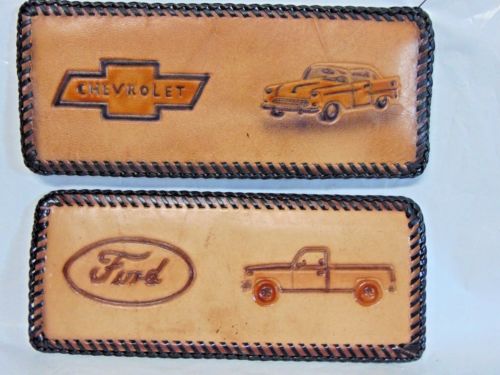 2 vintage HANDMADE leather ADVERTISING walletS CHEVROLET CAR FORD TRUCK $9.95 nr