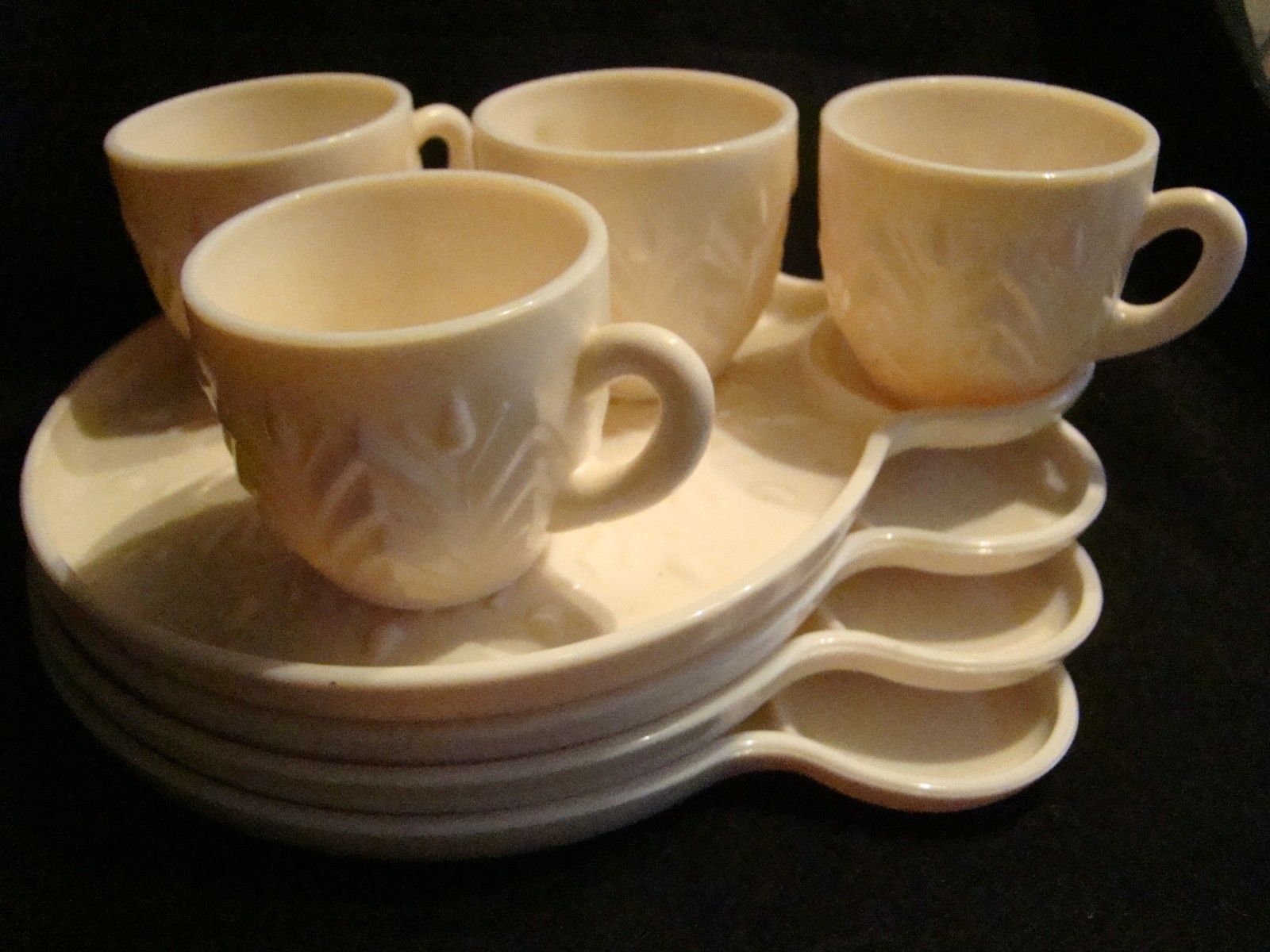 4 Jeanette Shell Pink Milk Glass Snack Set Feather Pattern set of plate and cup