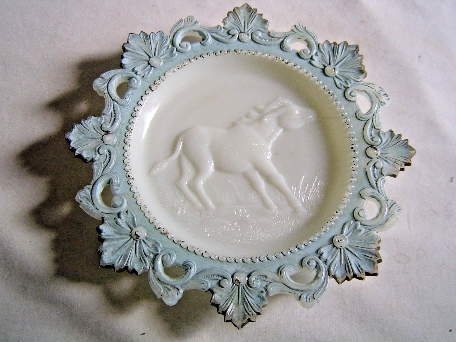 Title (ebay affiliate link): ANTIQUE VINTAGE MILK GLASS HORSE PLATE WESTMORELAND LACEY EDGE