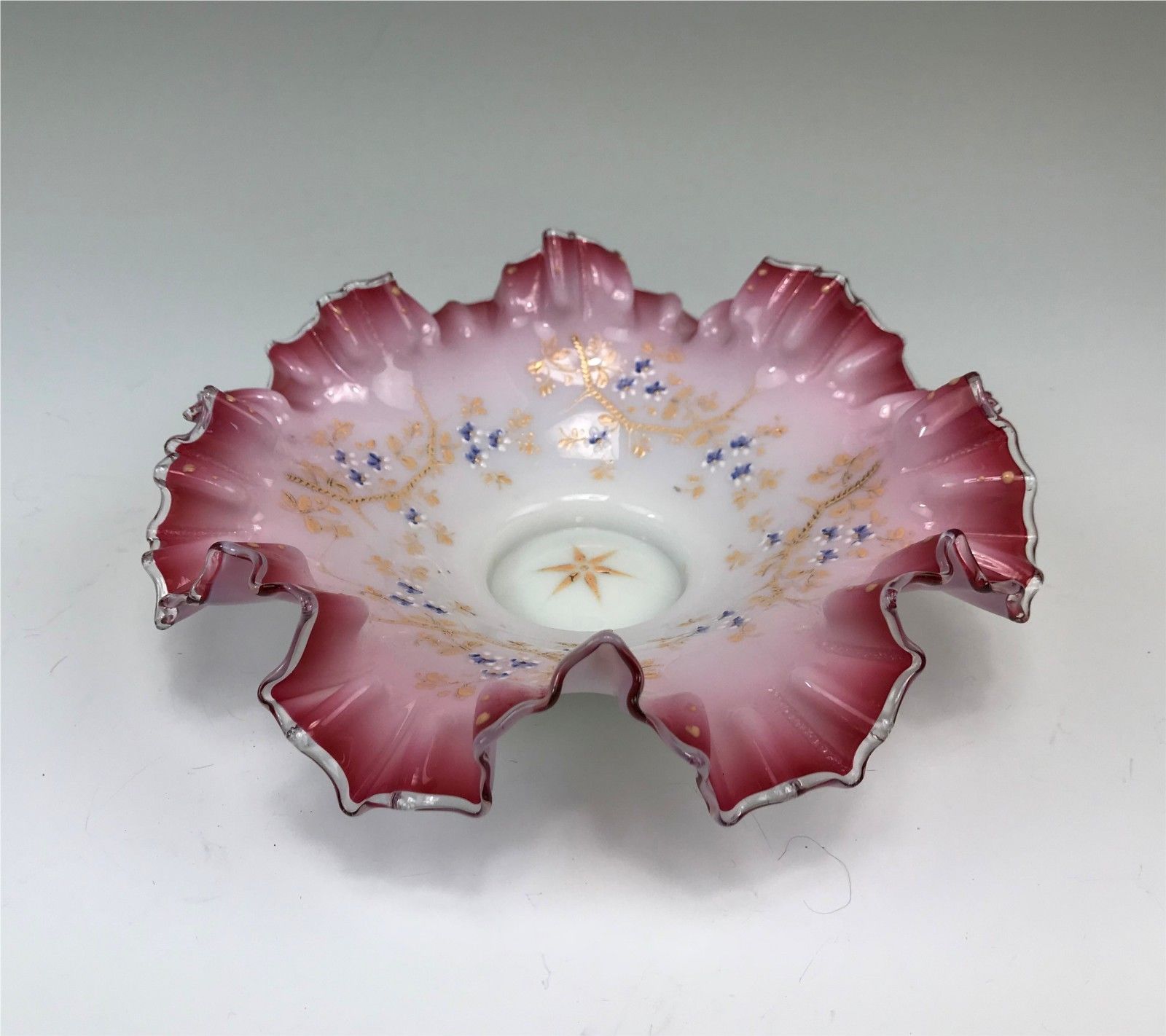 Enamel Decorated Antique Crested Pink Glass 9" Bride''s Bowl
