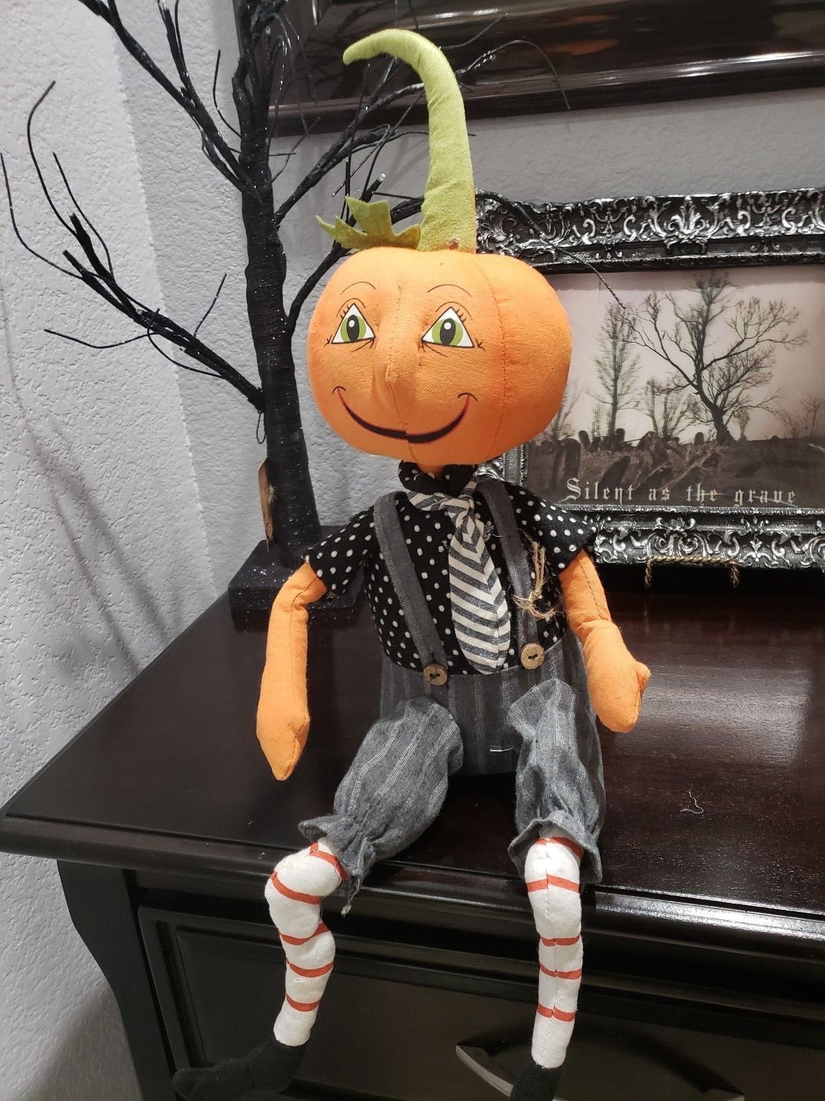Title (ebay affiliate link): Halloween Primitive Folk Art Rag Doll Pumpkin Head Shelf Sitter Tabletop Decor