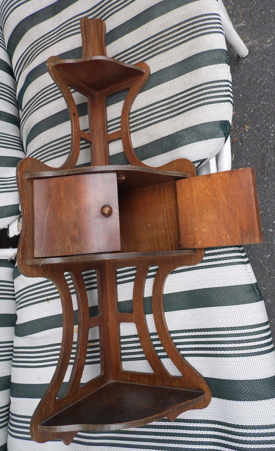 Title (ebay affiliate link): Mid Century Wood Corner 3 Shelf Wall Cupboard 2-Door 26 3/4" Tall