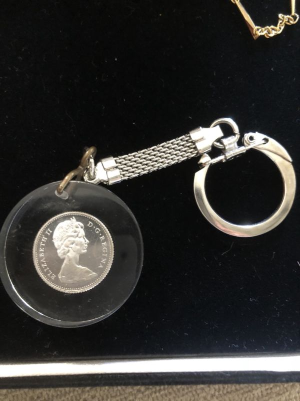 Title (ebay affiliate link): Vintage 1968 Canada Dime Silver Tone Key Chain Coin Lucite