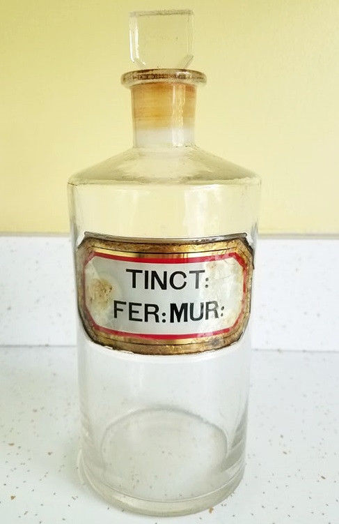 Title (ebay affiliate link): Antique Apothecary LUG Label Under Glass Jar TINCT FER MUR Drug Pharmacy Medical