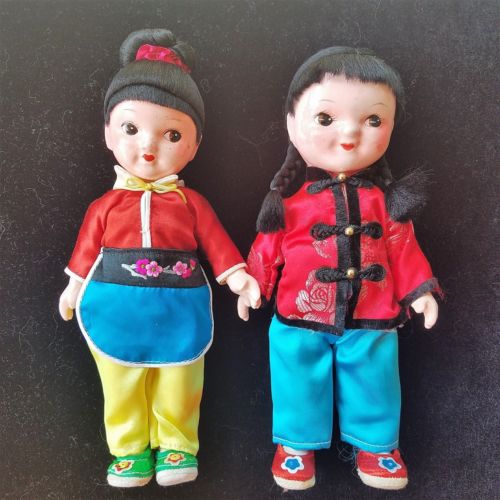 Title (ebay affiliate link): Pair of Vintage Oriental Paper Mache/Composition Girl Dolls, Silk cloth - 1950s