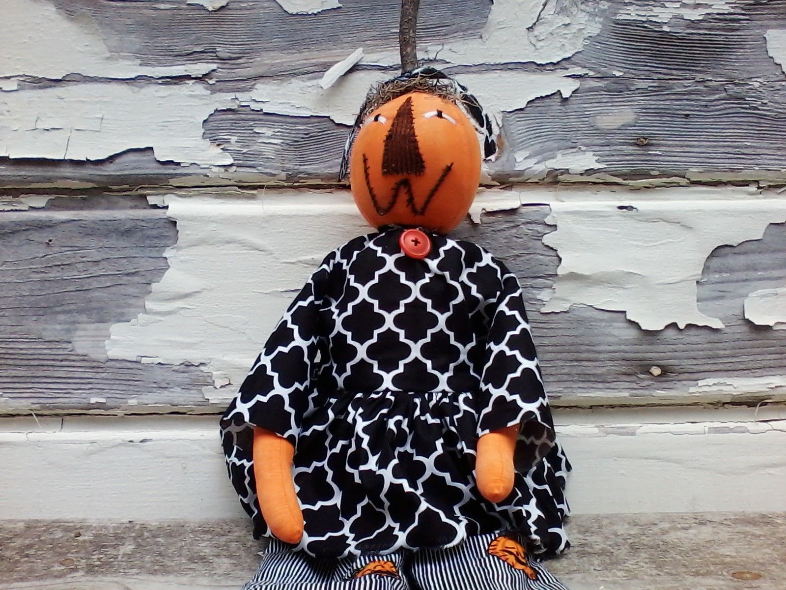 Primitive Halloween Orange Pumpkin Head Doll Ornie Shelf SItter Decor