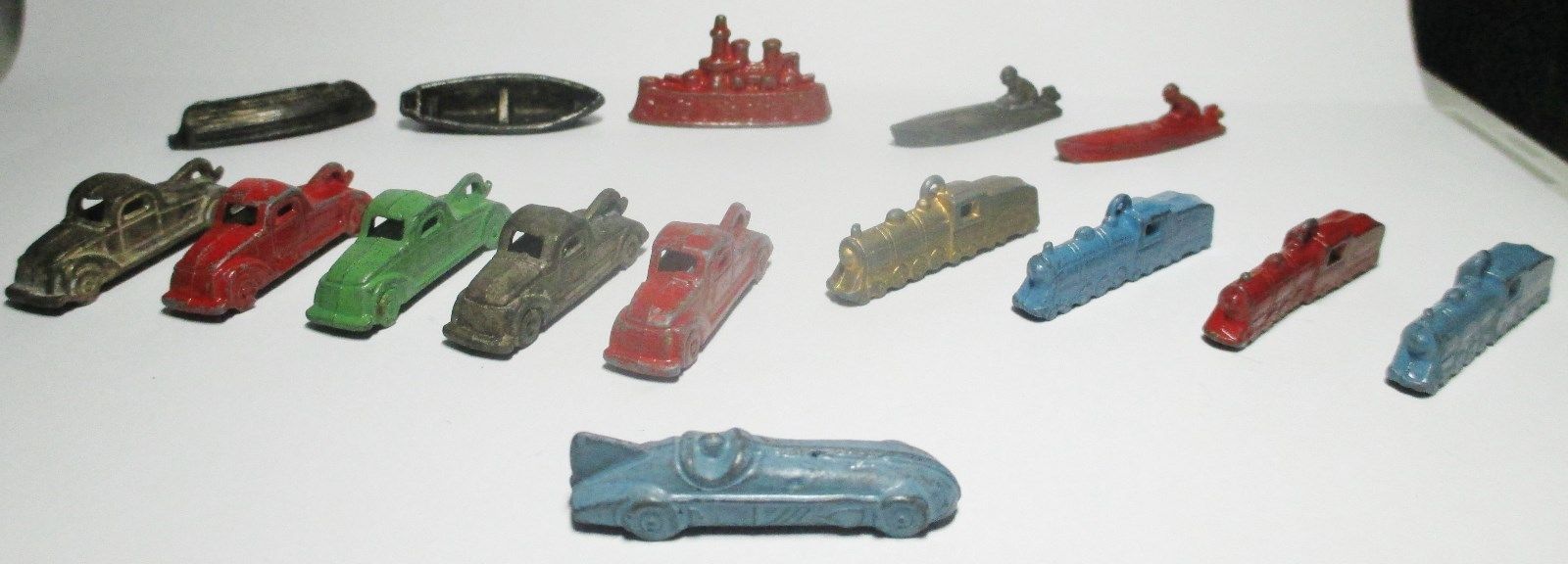 15 CRACKER JACK? TOOTSIETOY? TOY PRIZES--TOW TRUCKS, LOCOMOTIVES, BOATS, RACER