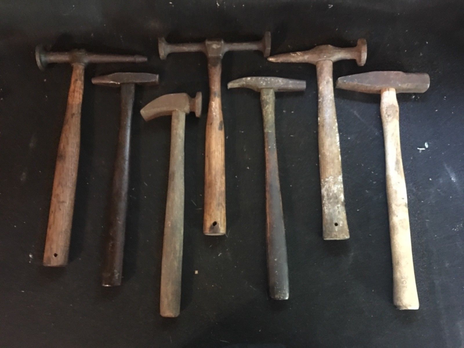 Title (ebay affiliate link): Antique Lot Of 7 Old blacksmith cobbler tinning hammers, Stanley, Malco farm