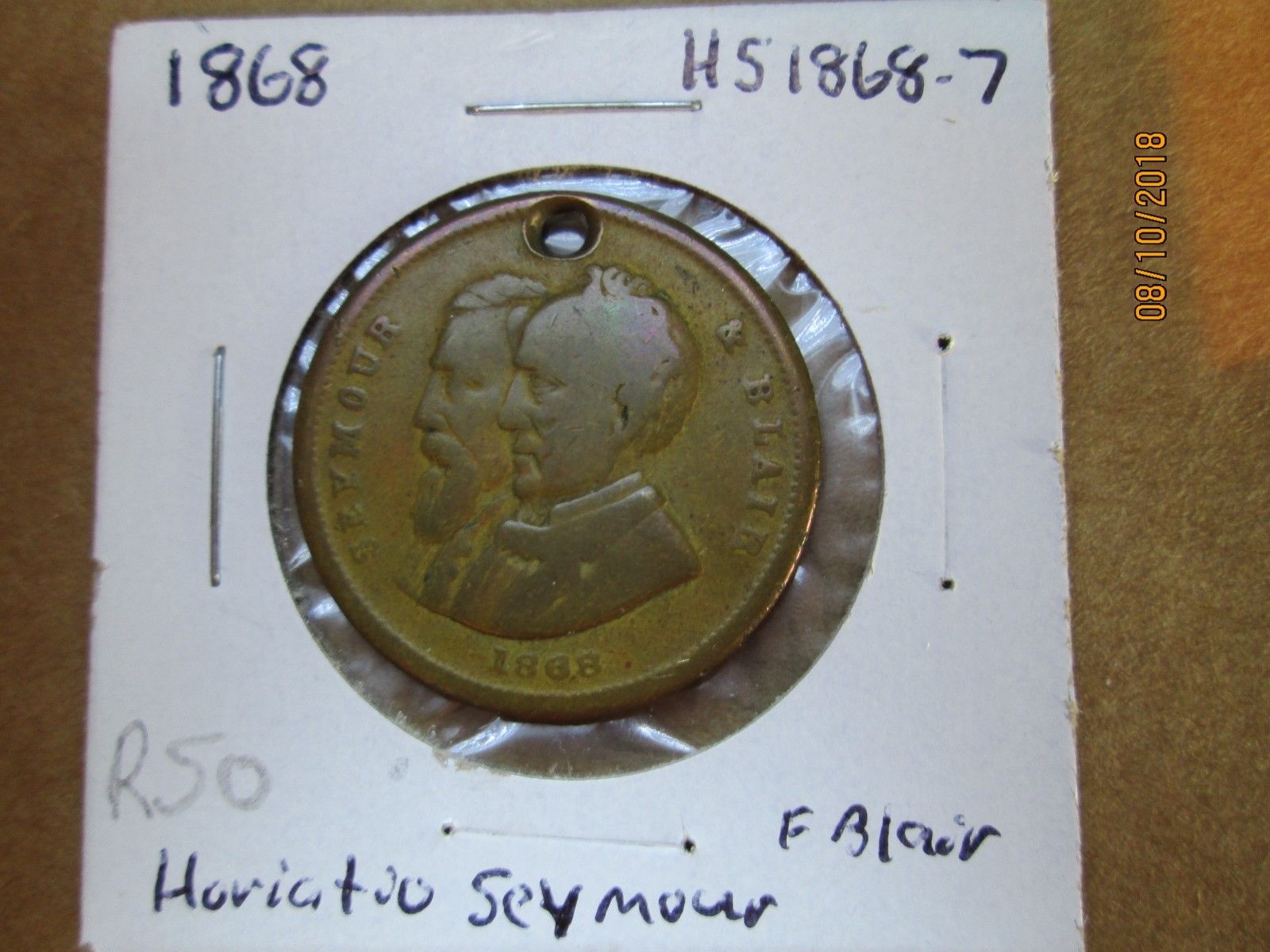 Title (ebay affiliate link): 1868 Horiato Seymour DW-HS1868-7 Blair Token holed