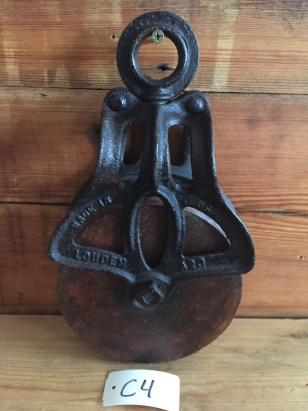 Title (ebay affiliate link): C4 - VTG ANTIQUE LOUDEN A23 USA CAST IRON WOOD BARN PULLEY~