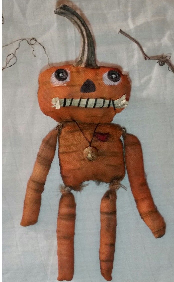 Title (ebay affiliate link): Primitive Grungy Pumpkin Boy Door Decor Halloween Doll Vintage Folk Art Stem Boo